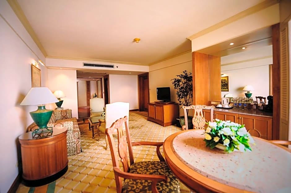 Why not go all out? For an unforgettable experience in Bangkok, stay in our King Suite. This is the most gorgeous and luxurious accommodations in Montien Riverside Hotel. This suite has everything: a spacious dining room with a fully-equipped pantry room for preparing meals that can adapt to a meeting room or private party room, a large living room, and a bedroom with an enormous bed that is custom-made and twice the size of a king-size. Guests can relax in our commodious bathrooms, which feature a large Jacuzzi and separate showers. Each room offers the magnificent Chao Phraya River view from several large windows perfect for business travelers and vacationing families who are looking for a taste of luxury at a riverside family hotel to spend a quality time.